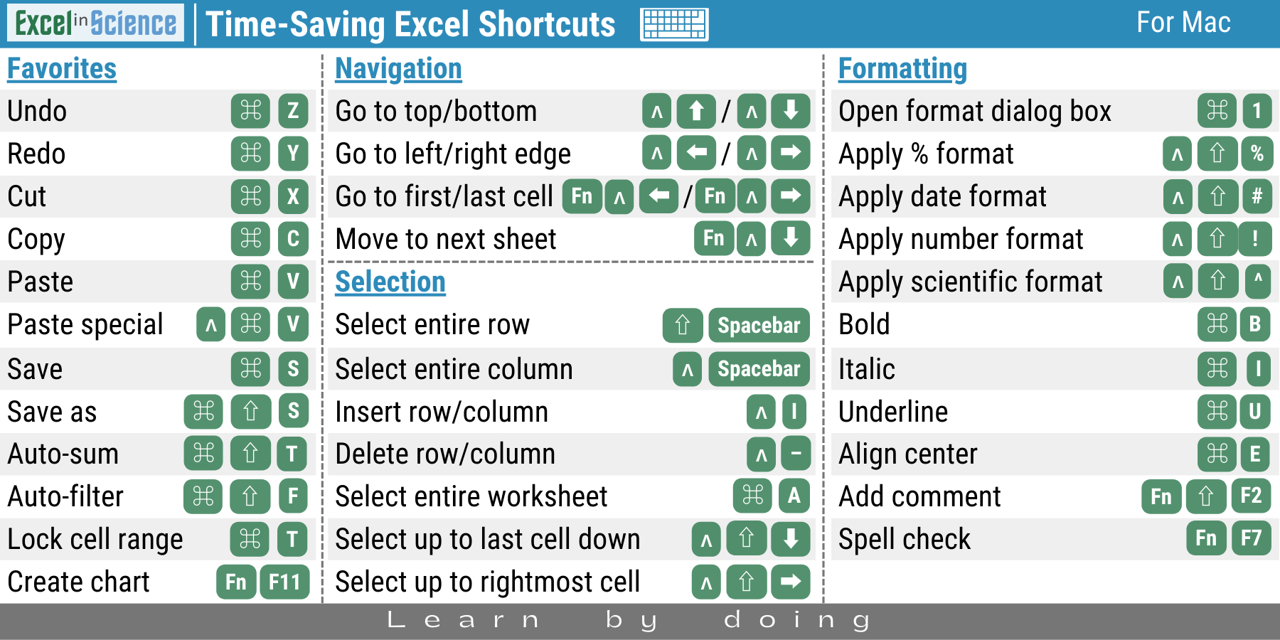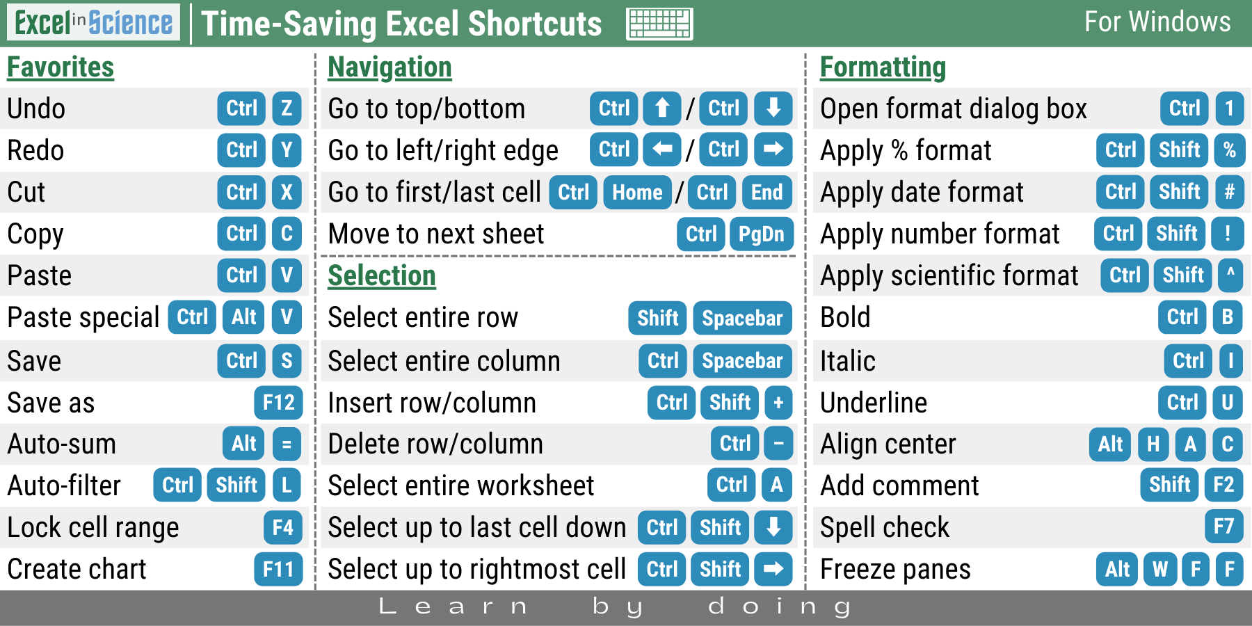 Are you a scientist who needs to crunch and analyze data quickly? Microsoft Excel includes lots of keyboard shortcuts that can make the process go faster, allowing you to move from one task to the next quickly and efficiently. Knowing how to use these shortcuts will save precious time on data-intensive projects, making them simpler and less time consuming. Take a look at some frequently used keyboard shortcuts for scientists in Excel! Get the free, printable version and attach it to your desk for quick reference during work!